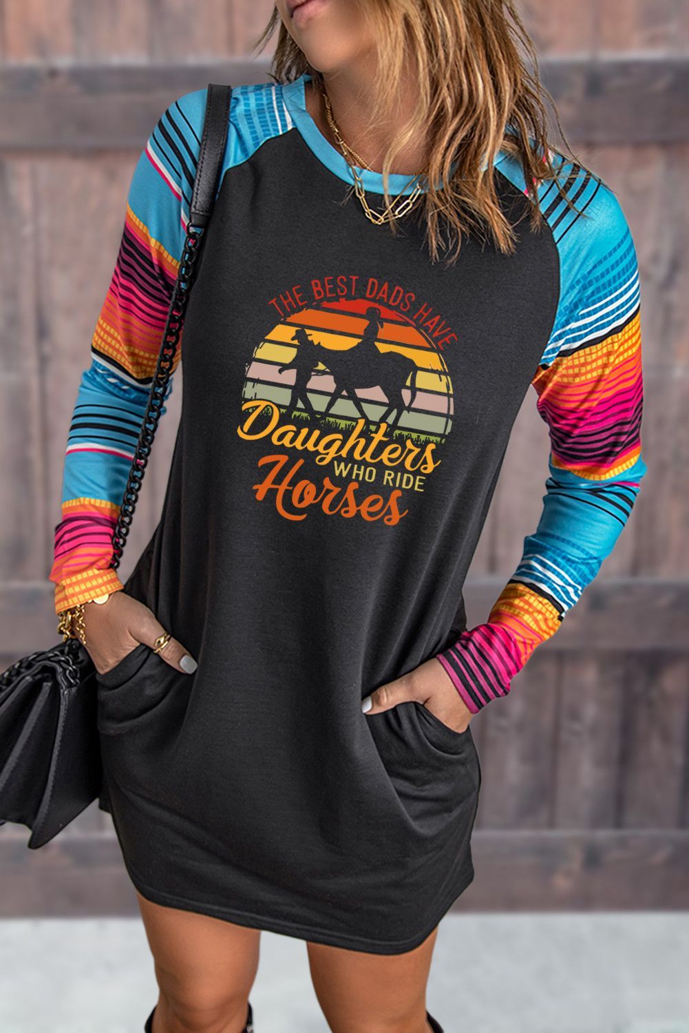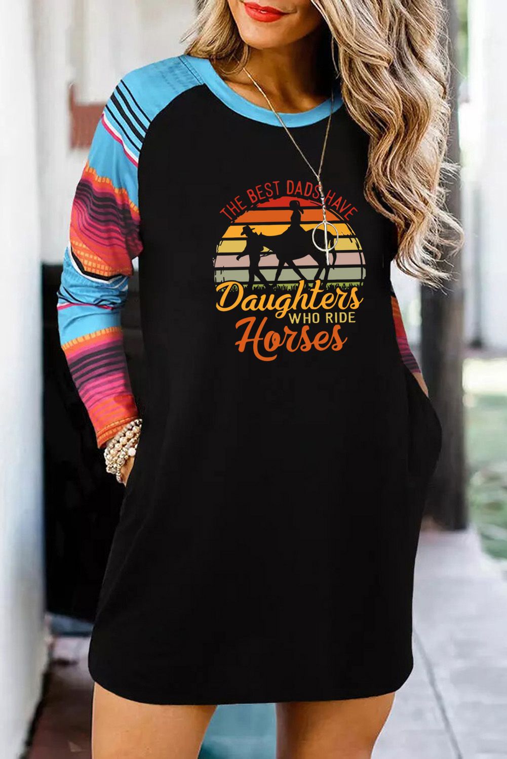 Black THE BEST DADS HAVE Daughters WHO RIDE Horses Serape Sleeve Patchwork Short Dress