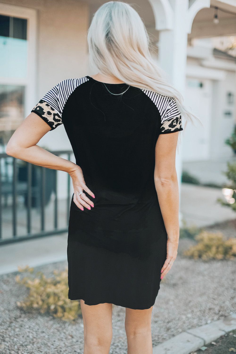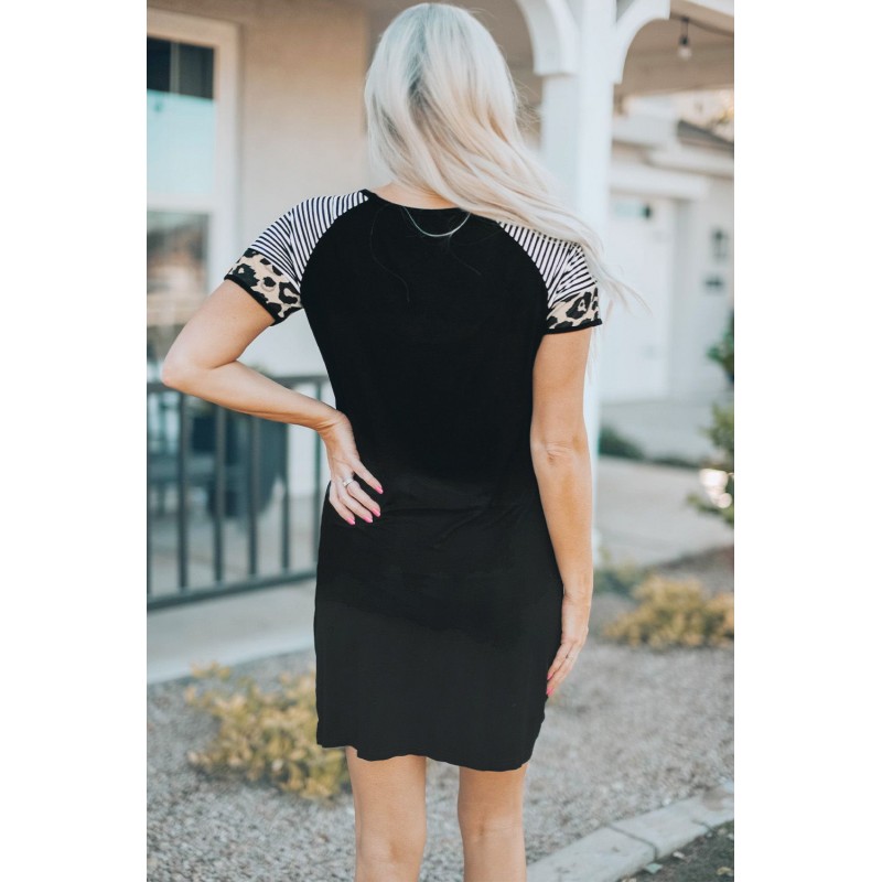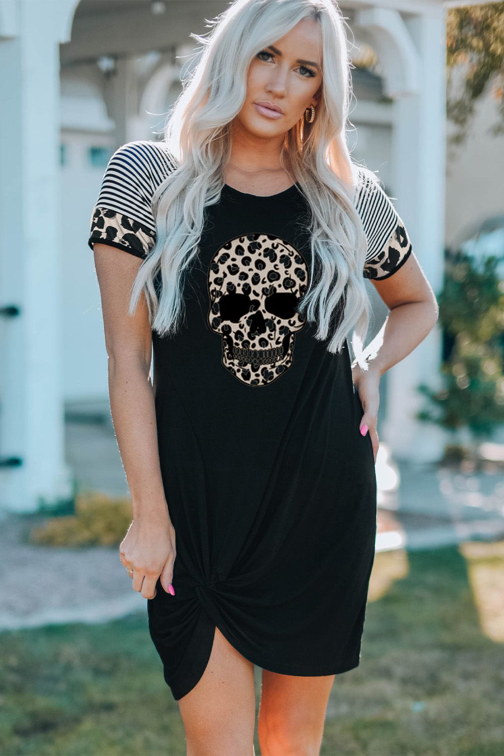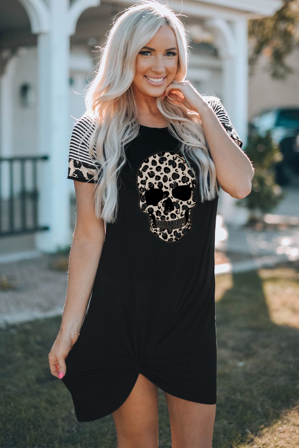 Black Leopard Ghost Graphic Mixed Print Sleeve T Shirt Dress with Twist