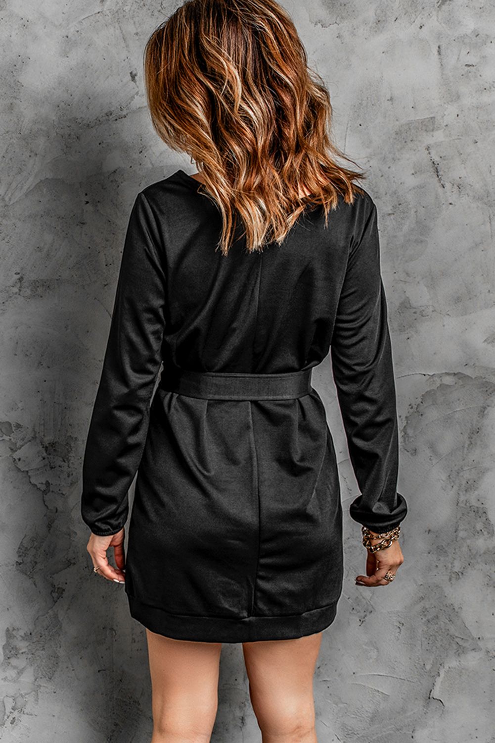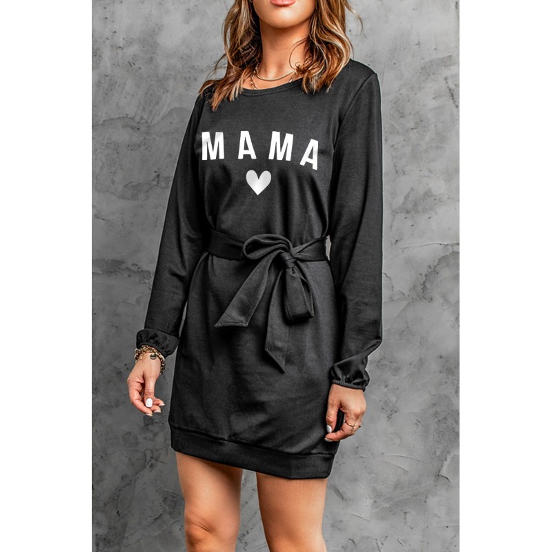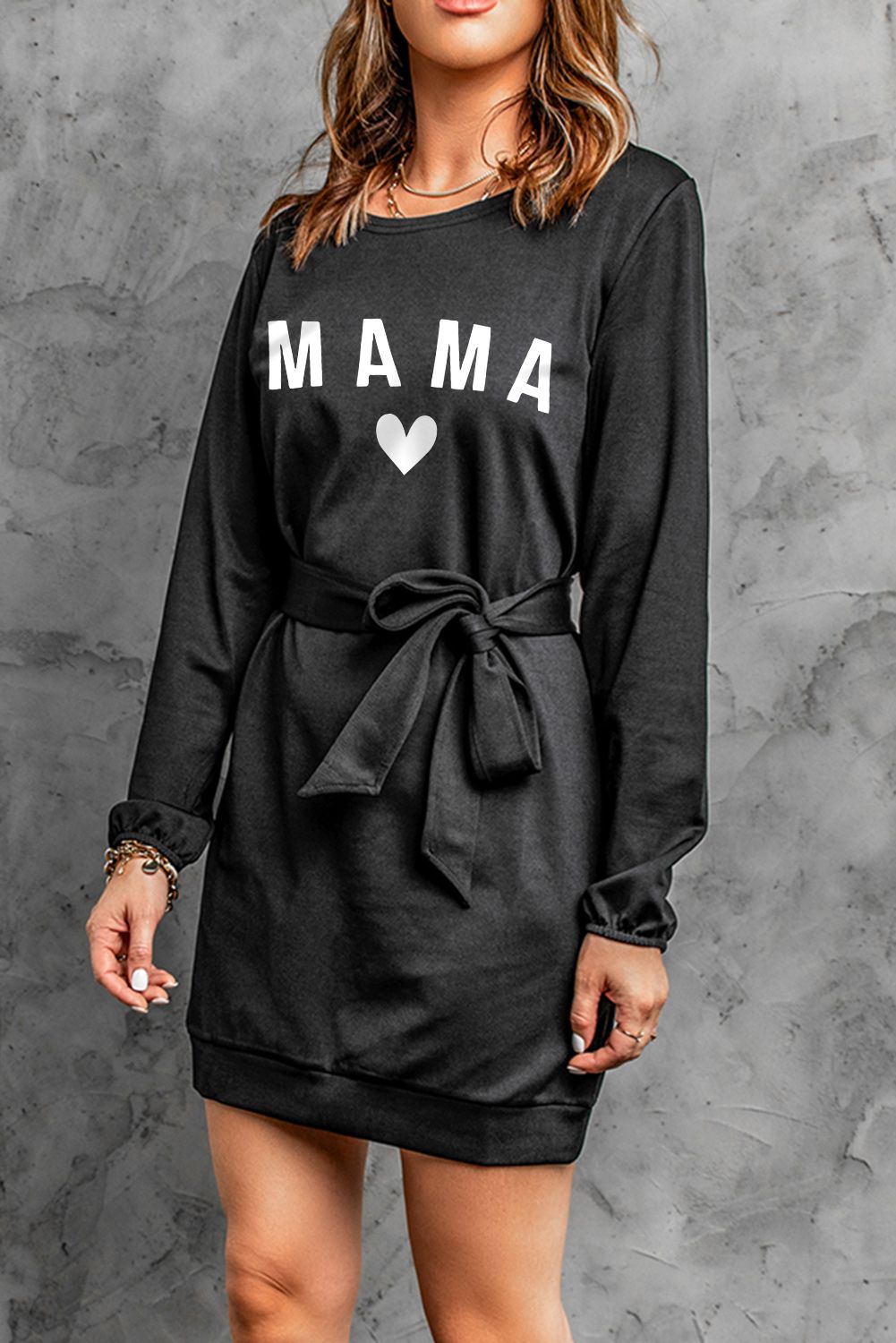 Black MAMA Heart Shaped Print Tie Waist Long Sleeve Mini Dress
