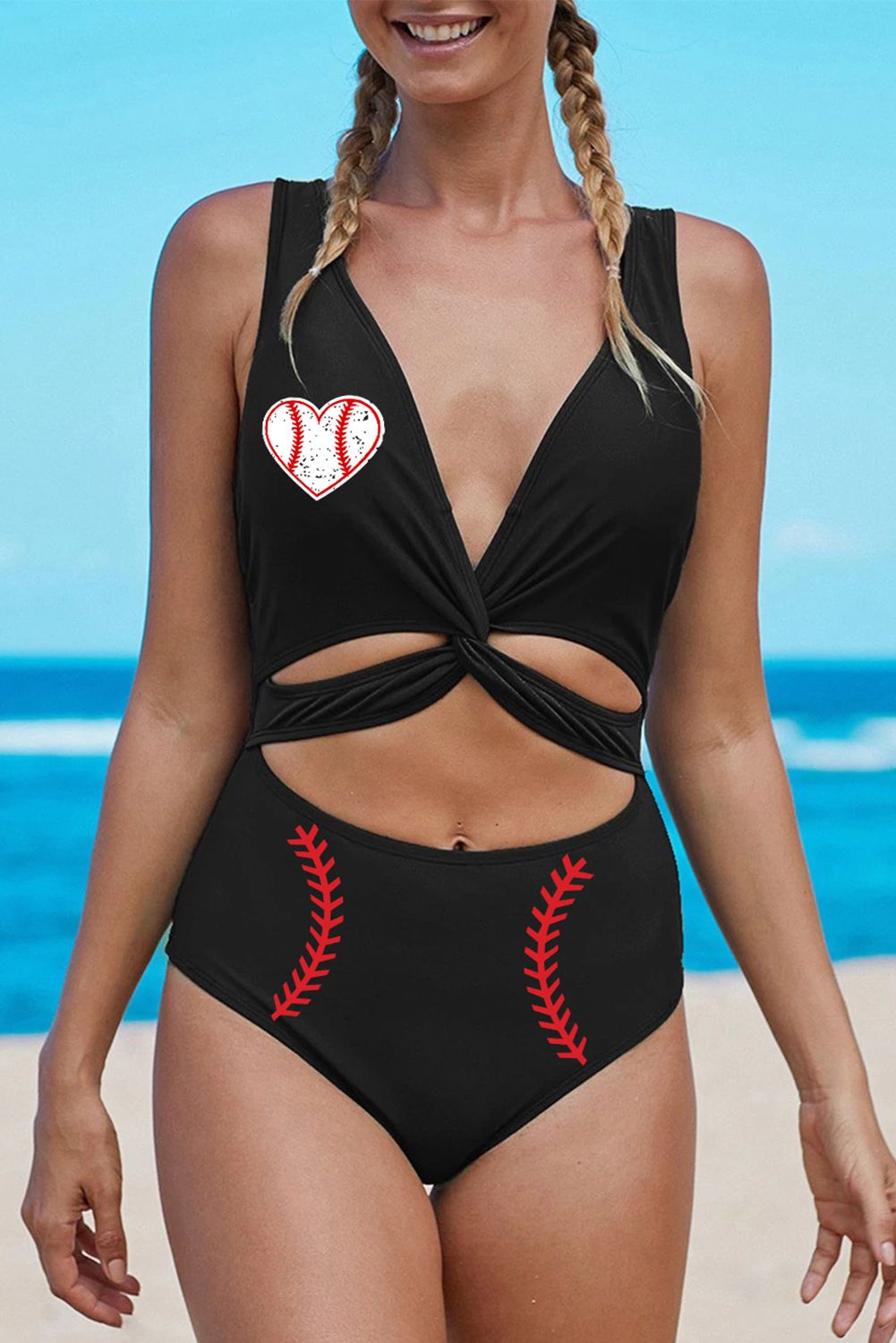 Baseball Heart Print Cut-out Criss Cross One-piece Swimwear