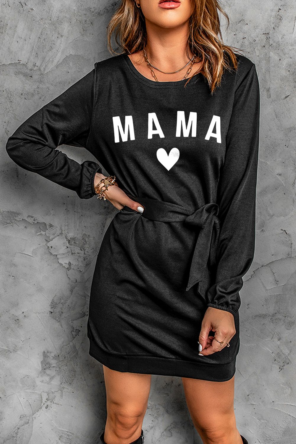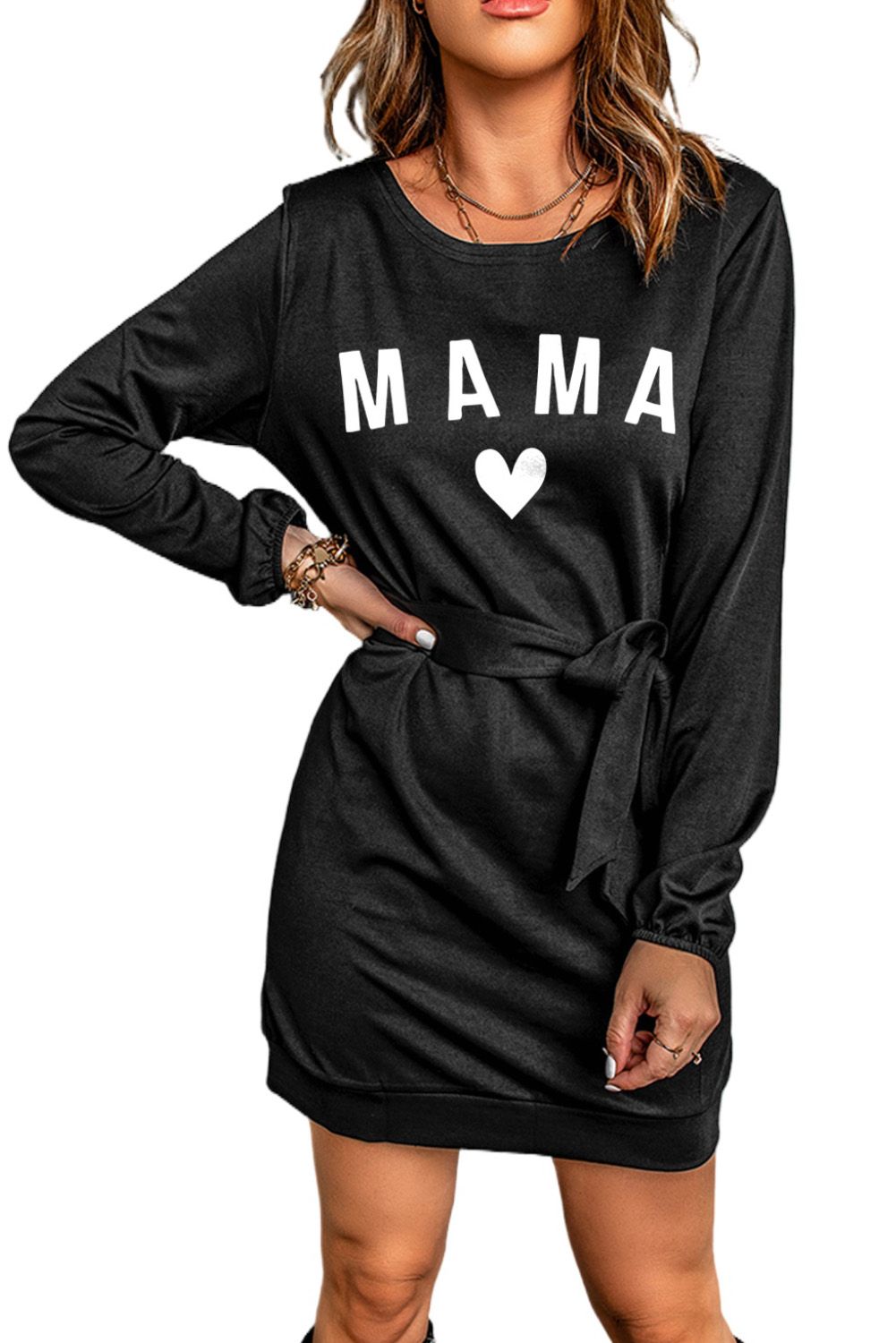 Black MAMA Heart Shaped Print Tie Waist Long Sleeve Mini Dress