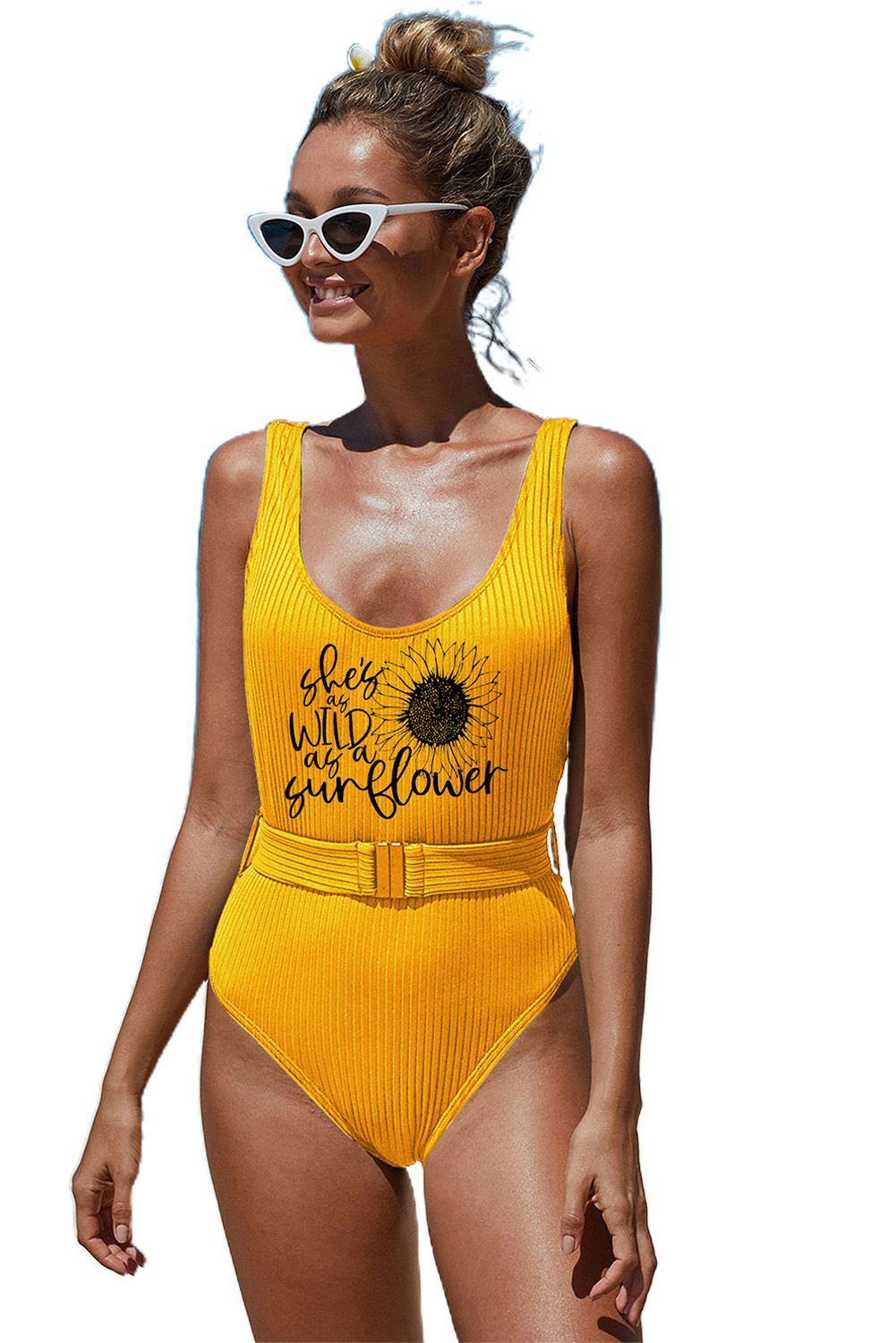 Letter Sunflower Print Ribbed Belted One-piece Swimsuit