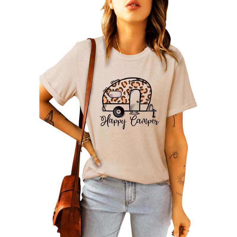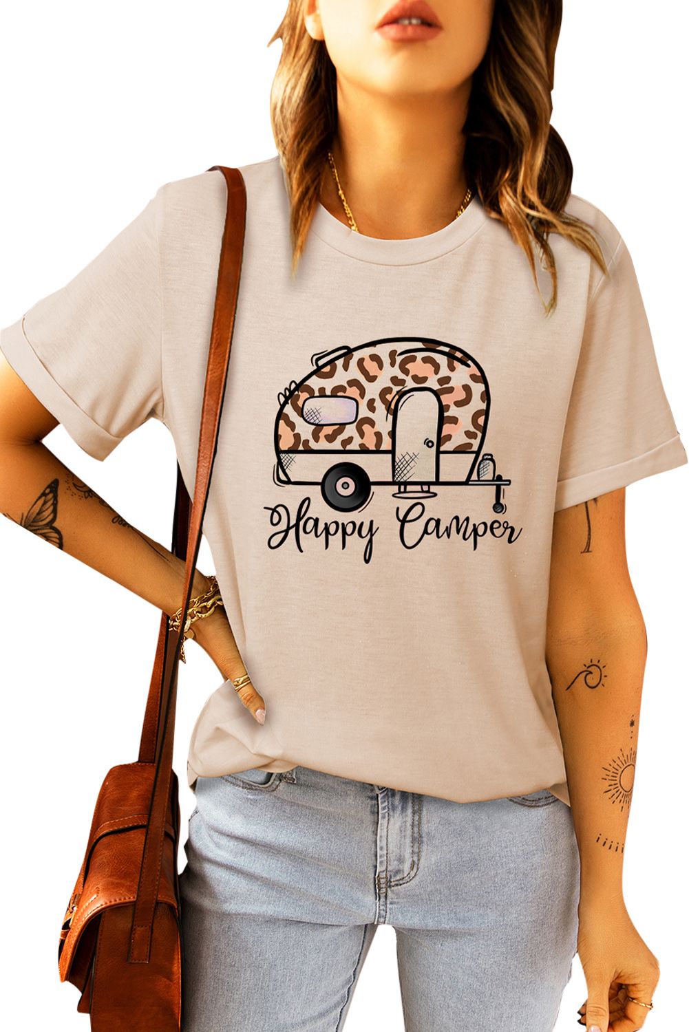 Khaki Happy Camper Leopard Car Print Short Sleeve Graphic Tee